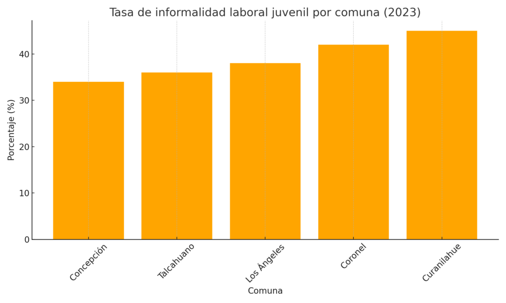 La informalidad laboral entre jóvenes entre 18 y 29 años en Biobío alcanza el 39%, superando el promedio nacional. Esta situación es más crítica en comunas semiurbanas donde la desindustrialización ha dejado economías frágiles sin redes de inserción juvenil.